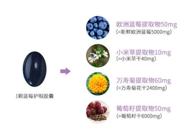 我们都知道,眼睛中的抗氧化物会随着时间的流逝而变少,提供不了足够的抗氧化物来中和氧化反应,造成眼睛疲劳,眼干眼涩,老化性功能退化等。而蓝莓富含的花青素,可以维持双眼内部组织的活力,强化眼睛里面的微血管壁,促进血液循环,维持正常血球压力,缓解大部分眼睛问题。花青素还可以为眼肌血管补充营养,对近视眼很有帮助。小米草黄酮,能够激活细胞,促进他们的眼部血液循环以达到缓解眼部疲劳。成分中万寿菊的天然作用,能为中老年人带来必需的叶黄素,过滤对眼睛带来伤害的光线与自由基。葡萄籽这个功效大家更应该了解了吧,有超级强大的抗氧化作用。